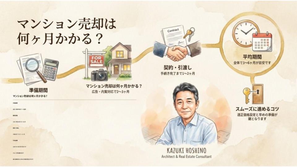 これは、私が岡山で売主様から最も多く受ける質問の一つです。住み替えや相続、転勤など、売却には“期限”があることも多く、先が見えない不安は大きいですよね。大手不動産会社時代、私は高すぎる価格設定で売却が長引き、結果的に売主様の時間を奪ってしまった苦い経験があります。だからこそ今は、建築士と宅建士の視点から「なぜ期間に差が出るのか」「どうすればスムーズに進められるのか」を正直にお伝えしています。この記事では、マンション売却の平均期間とその内訳、そして早期売却のために売主が押さえるべき流れを、岡山の実例を交えて分かりやすく解説します。読み終えた頃には、ご自身の売却スケジュールが具体的に描けるはずです。