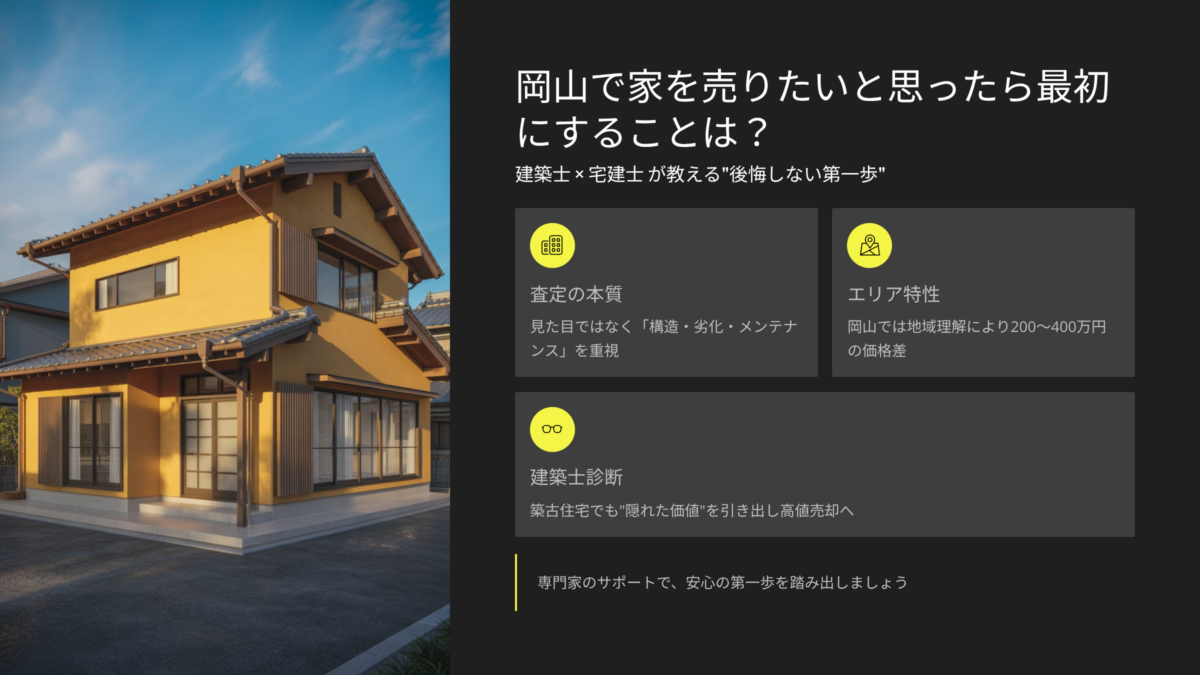 岡山で家を売るうえで大切なのは、“高額査定”に一喜一憂することではなく、あなたの家の本当の価値を理解することです。建築士として多くの家を見てきた経験から言えるのは、査定の質が売却結果を大きく左右するということ。