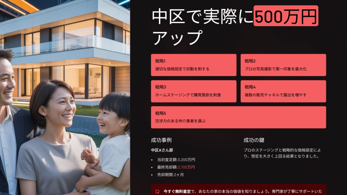 この記事では、岡山で家を高く売るために売主が必ず知っておくべき「5つのコツ」を、一般論ではなく、岡山市中区で実際に売却価格が500万円アップした成功事例を交えながら、分かりやすく解説します。